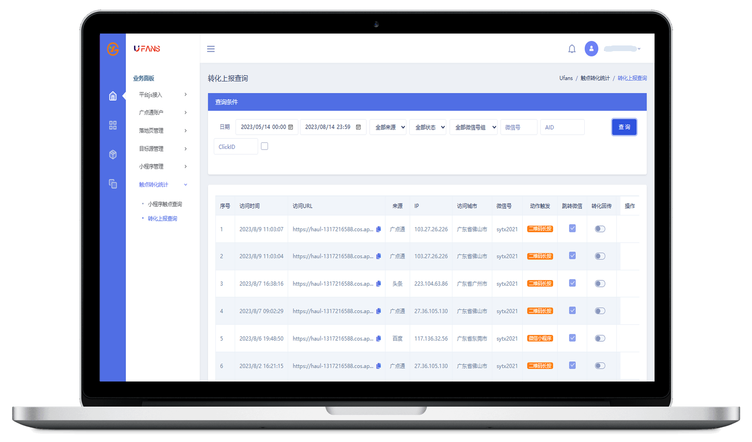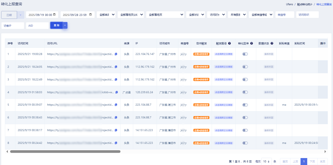 可实现页面实时微信在线监测、及时管控、灵活配置;可配置微信小程序跳转打通外部生态环境与微信链路;可配置并实现与广告平台的转化数据自动/手动回传上报。